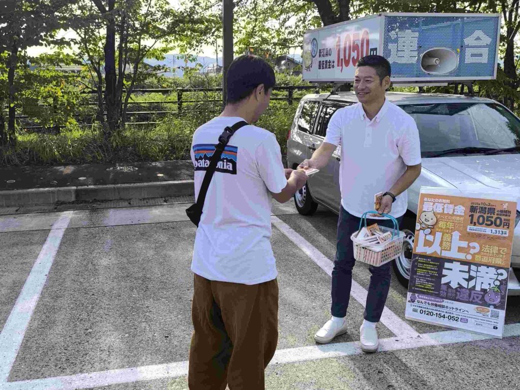 街頭でアピールしたポイントは、①新潟県の最低賃金は、10月2日から、65円引き上げられ、時給1050円となります。②深夜の時間帯、夜10時から朝5時までに働いた分は、賃金が割り増しになり時給1313円以上じゃないと法律違反です。③パートタイマーも、アルバイトも、国籍や年齢も関係ありません。新潟県で働く人、すべてが対象です。④新潟県の最低賃金は全国平均より71円も低く、東京と新潟の差は176円もあります。「同じ仕事をするなら、高い給料のところで働きたい」、そう思うことは当たり前です。人口減少と労働力不足が大きな問題となっている新潟県にとって、最低賃金が低いことは大きな問題です。⑤計算方法がわからない方、最低賃金に届いていないという方、その他、職場で何か困っていることのある方は、連合にご相談ください。
