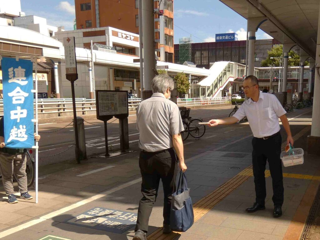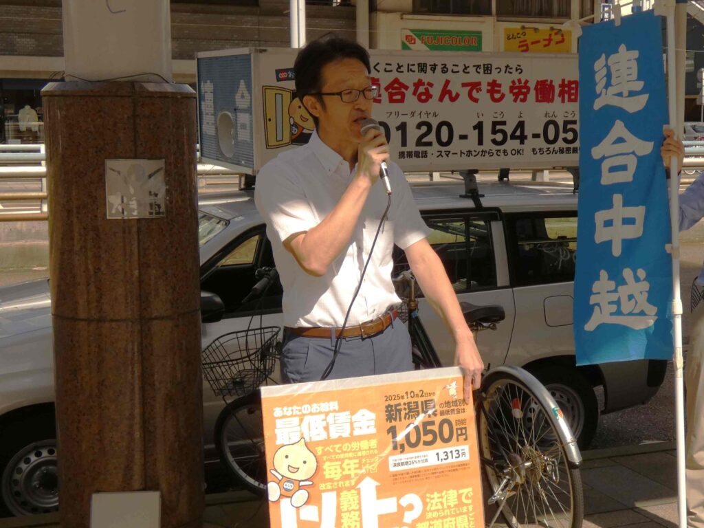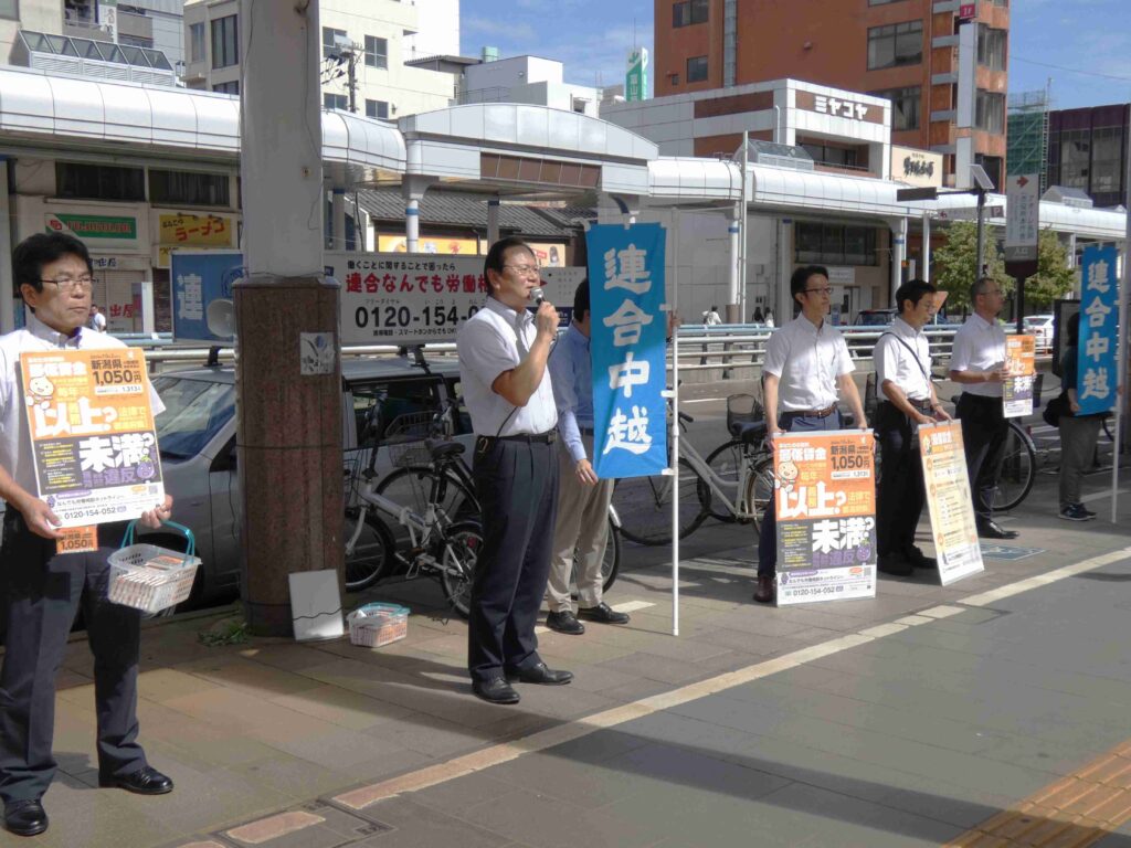 これにあわせて、9月30日(火)正午からアオーレ長岡前で街頭宣伝行動を行いました。行動には中越地協幹事会役員の他、五十嵐良一市議会議員、松野憲一郎市議会議員からも参加いただき、街頭から最低賃金の引き上げ改定とともに、最低賃金制度の重要性などをアピールしました。