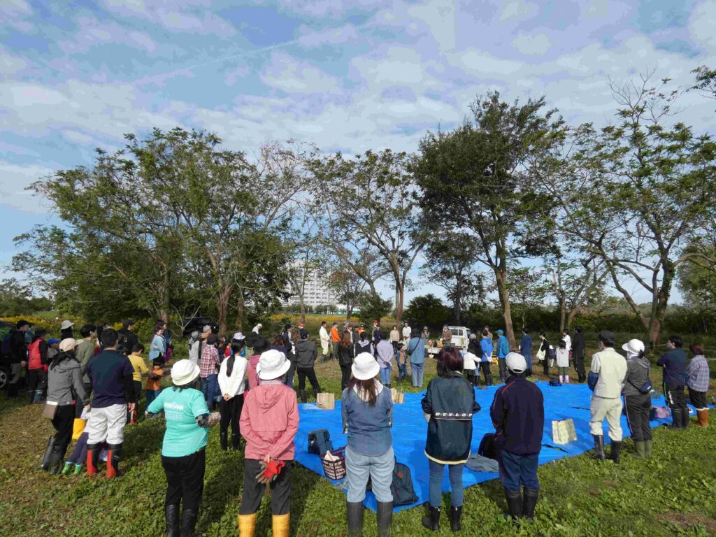 秋晴れの空のもと、10月25日(土)午前8時45分から、信濃川河川敷の福祉市民体験農園「OasisS R」で「畑仕舞い・サツマイモの収穫と玉ねぎの作付」が行われました。主催はNPO法人UNEと連合中越地協、フードバンクながおか。支援者や家族連れなど約100人が参加し、にぎやかで笑顔あふれる一日となりました。