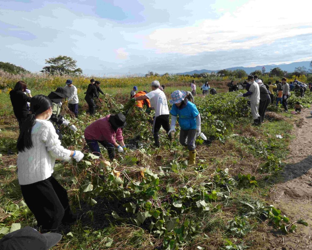 作業は各団体の畑に分かれてスタート。連合の畑では、まずサツマイモの収穫から。大きく伸びたつるを片付けるのはなかなかの重労働でしたが、子どもも大人も力を合わせて奮闘。つるの下から顔を出したサツマイモは、まるでラグビーボールのような大物から可愛らしい小芋までさまざま。今年はネズミの被害も少なく、形の良い芋がたくさん収穫できました。約40分の作業で、なんと200キロを超える成果に参加者もびっくり。