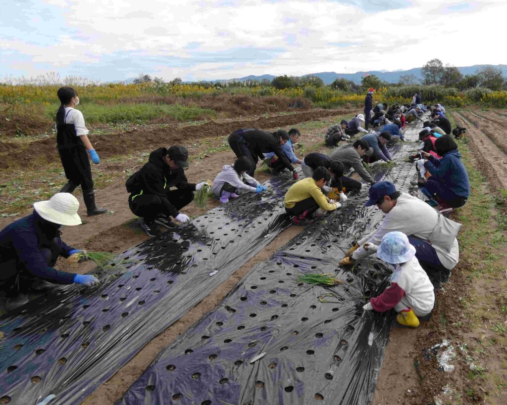 続いて玉ねぎの作付け。40メートルの畝2本に、約2,500本の苗を植えました。苗を一本ずつ丁寧に植える作業は根気がいりましたが、「来年の収穫が楽しみだね」と声をかけ合いながら、約30分で見事に完了。初夏の収穫を心待ちにしています。