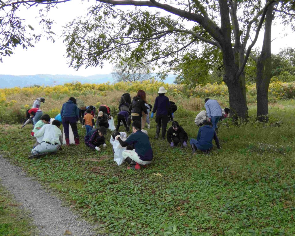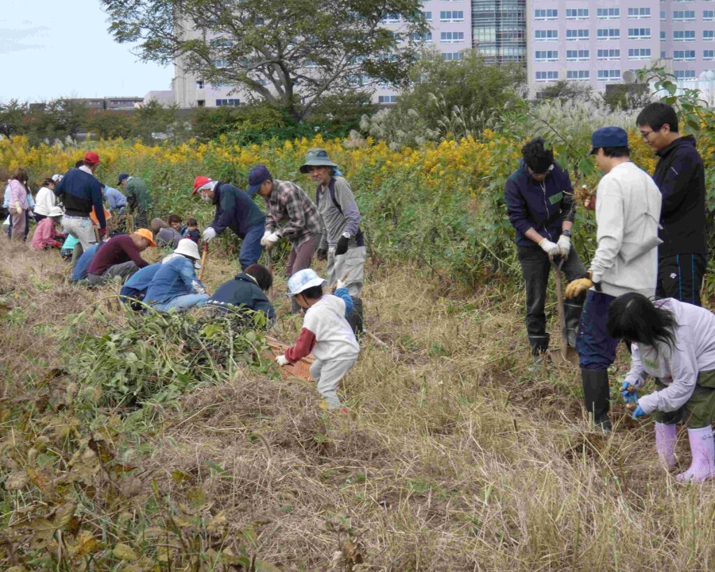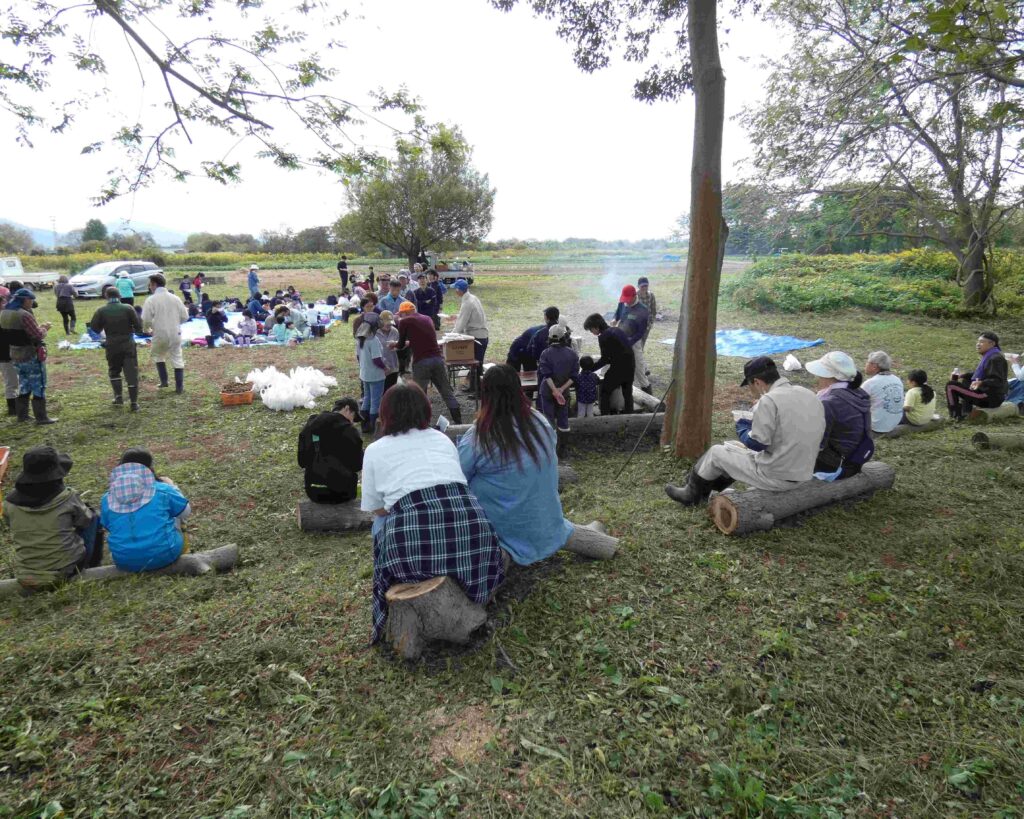 作業後は飲み物を片手にほっと一息。交流の輪が広がった後は、UNEの畑の整備や人気のキクイモの収穫、親子連れはクルミ拾いに挑戦しました。お昼にはUNE特製のしょうゆ赤飯と芋煮がふるまわれ、「働いた後のご飯は最高!」と笑顔がこぼれました。
